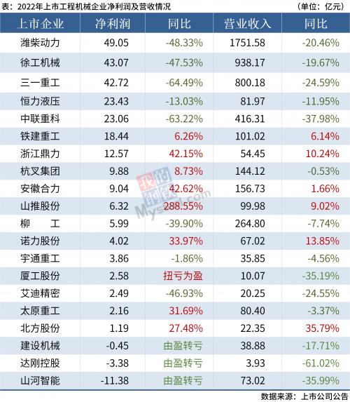 17家企业实现盈利。其中,8家企业净利润同比增长,山推股份增幅最大,2022年净利润同比增幅高达288.55%;8家企业净利润同比下滑,三一重工跌幅最高,达64.49%;厦工股份扭亏为盈。