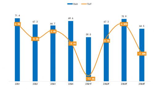 2020Q1-2023Q4F全球电视面板出货量及同比