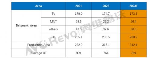 当前产能依然过剩,虽然2023年1月随着LGDP7+CECG6的退出,这两条产线折合成G8.5产能是180Ksheet/M;且新产线投资放缓,但是国内工厂通过增加设备来扩大产能,BOEB17最大产能已扩增至200Ksheet/M,CSOTT7最大产能已达到140Ksheet/M,华星T9Phase1计划年底产能达到90Ksheet/M,整体来看,产能减少不明显。奥维睿沃(AVCREVO)数据显示,2022年生产TV面板的产线的整体最大产能达到315MO,相比于2021年增长11%,2023年整体产能面积仍高达312.4MO,基本与2022年持平。
