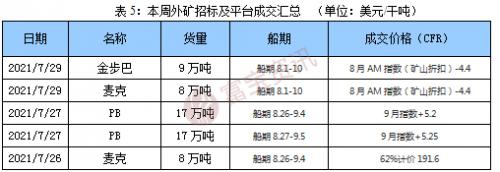 2.进口矿方面本周普指跌破200美金。下半年钢厂限产导致铁粉补库锐减,无论港口还是远期资源成交寥寥,配合连铁破位1100,市场恐慌抛售增多。匹粉跟金步巴价差收窄,如行情进一步下跌,匹粉性价比又将显现。港现报盘方面,目前天津港58%杨迪1125-1135元/吨、PB粉1330-1340元/吨、63%巴粗1335-1345元/吨,日照港62.5%巴混1420-1430元/吨、65%卡拉加斯粉1710-1720元/吨。海运矿价继续下跌,不仅因为下半年钢厂限产需求不佳,也因为大量供应过剩。远期市场内的资源很多,但很少有采购问津。随着供应紧张的缓解,8月至9月间的现货溢价继续收窄,但在需求全面走弱阶段,判断哪类品种相对于其他品种表现更好还为时过早。钢厂方面,高炉生产率已不再是钢厂追求的目标,对巴混、卡粉一类高品需求也不断下降。不过相对于澳洲资源的庞大体量,巴西资源供应有限,反而一定程度上支撑了其价格。港口方面,超特、金步巴等成本性价比高的货物获得了较高流动性,也收窄了跟PB粉的价差。矿商认为如果PB粉和金步巴粉的价差进一步收窄的话,PB粉的性价比又要高于金步巴。对于本轮铁矿下跌的缓解,可能要重新寄希望于钢材旺季需求的启动,从钢厂利润角度来缓解矿的下跌,时间可能在8月中旬。预计下周普指在190美金附近震荡。