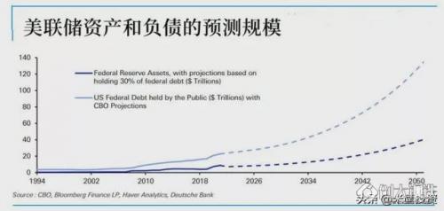 下图是德意志银行对2020-2050年美联储资产负债规模进行了粗略的预估,在现在8万亿的基础上要再翻5倍。平均6年翻一倍,而且伴随着中美博弈的加速,美联储资产负债表的规模很可能也会加速。