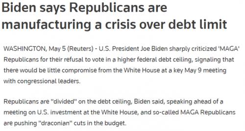 拜登还指出,债务违约是一场人为制造的危机。美国应该以负责任的方式削减开支,降低赤字,避免不必要的危机。