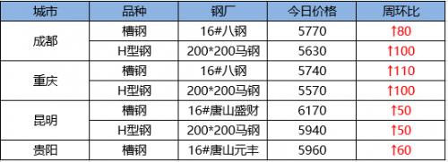 四川市场:本周川内型材价格大幅上涨,市场成交清淡。工角槽方面,周边型钢厂价格大幅上调,在后期补货成本压力下,市场贸易商报价纷纷上涨,北方资源部分规格紧缺,整体库存不高,淡季成交寥寥无几,贸易商心态较差;H型钢方面,市场库存充足,钢厂价格震荡上调,市场价格跟涨,整体成交一般。综上,预计下周四川型材价格或震荡运行为主。