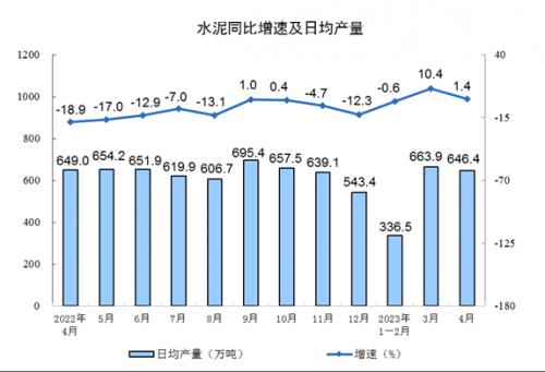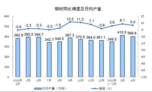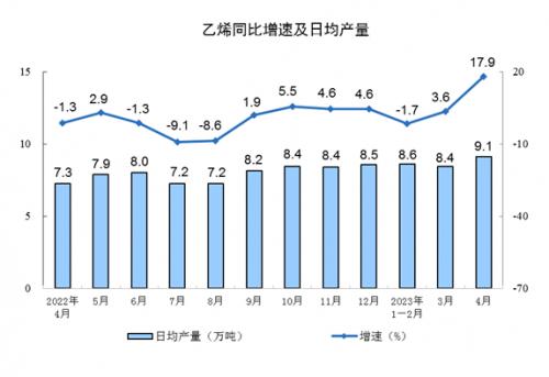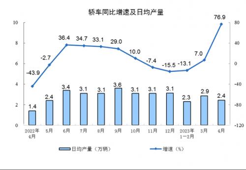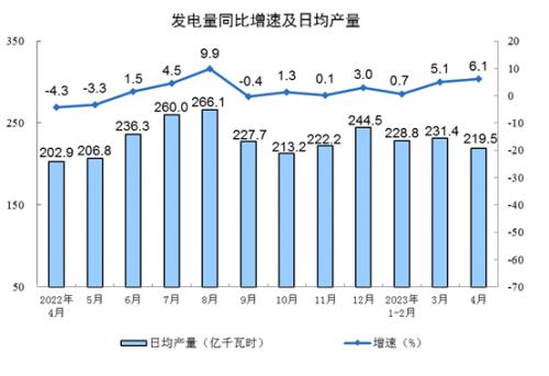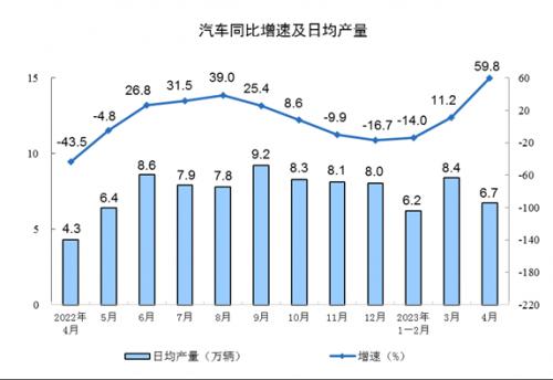 分产品看,4月份,620种产品中有358种产品产量同比增长。其中,钢材11995万吨,同比增长5.0%;水泥19392万吨,增长1.4%;十种有色金属604万吨,增长6.1%;乙烯274万吨,增长17.9%;汽车201.8万辆,增长59.8%,其中新能源汽车58.6万辆,增长85.4%;发电量6584亿千瓦时,同比增长6.1%;原油加工量6114万吨,同比增长18.9%。