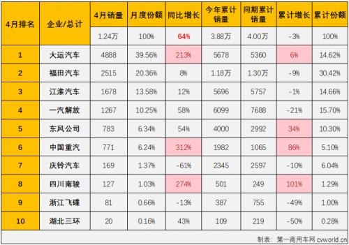 与去年同期相比,大运、东风、重汽、江淮和四川南骏等企业市场份额有所提升,份额提升最明显的是东风和重汽,今年1-4月累计份额分别提升了2.82个百分点和2.44个百分点,大运则提升了1.21个百分点,江淮和四川南骏分别提升了0.27个百分点和0.67个百分点。