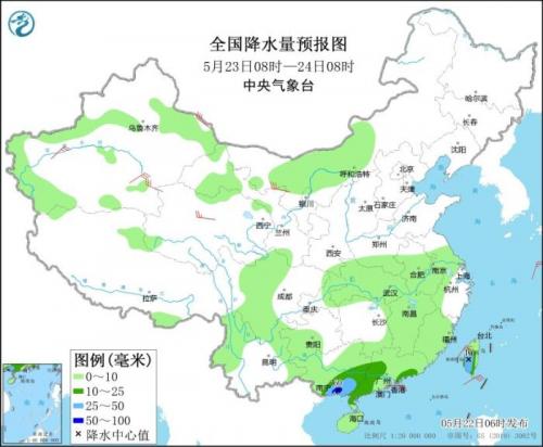 5月23日08时至24日08时,华南南部、台湾岛等地部分地区有中到大雨,其中,广西东南部沿海等地部分地区有暴雨(50~60毫米)。新疆南疆盆地、青海北部、甘肃河西等地部分地区有4~6级风。东海大部海域、台湾海峡、台湾以东洋面将有6~7级、阵风8~9级的风。