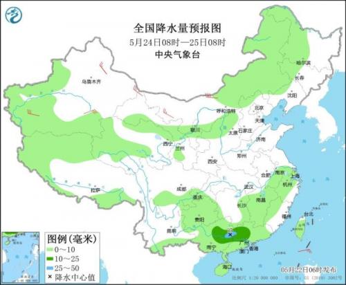 5月24日08时至25日08时,华南等地部分地区有中雨,其中,广西东部等地部分地区有大雨(25~35毫米)。新疆沿天山地区和南部、内蒙古中西部等地部分地区有4~6级风。