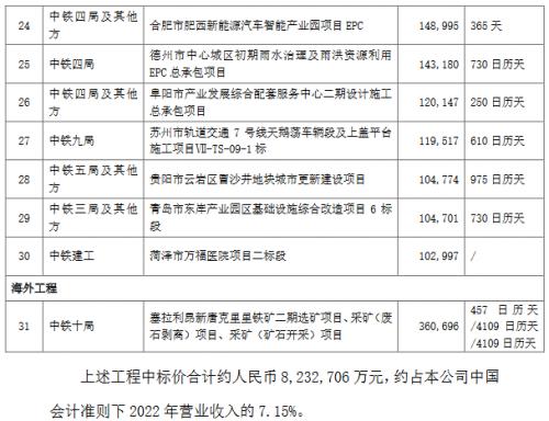 5月18日,中国中铁发布公告,近期,公司中标31个重大工程,中标价合计约823.27亿元,约占公司中国会计准则下2022年营业收入的7.15%。