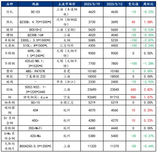 截止2023年5月19日,各原材料当日即时价格以及价格周环比情况如下: