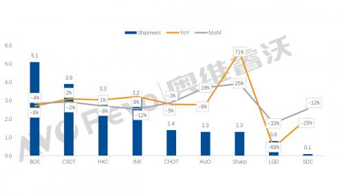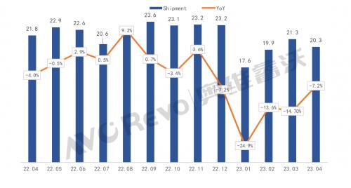 Sharp:4月出货1.3M,同环比双增,同比、环比增长分别为70.7%、24.9%。