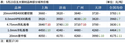 ◎5月23日,唐山迁安、秦皇岛卢龙等地普方坯出厂含税上调20,执行3380元/吨。