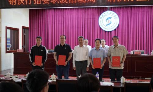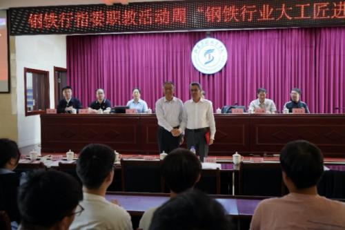 苏长永为刘宏、王伟、曲晓东、郑久强四位技能大师颁发钢铁行指委“钢铁行业大工匠进校园”活动导师聘书;山西工程职业学院院长宋军为刘宏、王伟、曲晓东、郑久强四位技能大师颁发山西工程职业学院“名誉技能大师”聘书。