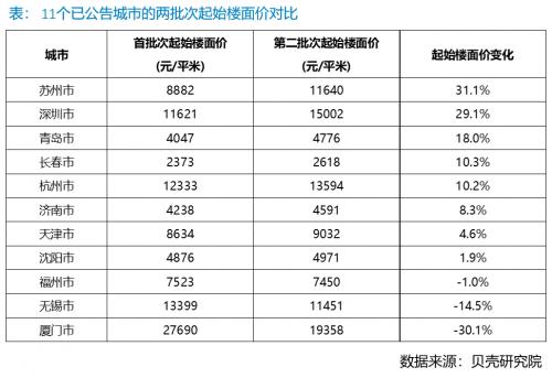 据贝壳研究院统计,至8月10日,22个集中供地城市中,已有11个城市公告了第二批集中供地计划。苏州、深圳、青岛、长春、杭州、济南、天津二批次起始楼面价,较首批次均有一定幅度上涨。其中,深圳虽然加大了非核心区土地供应的规模,但起始楼面价仍较首批上涨了29.1%。