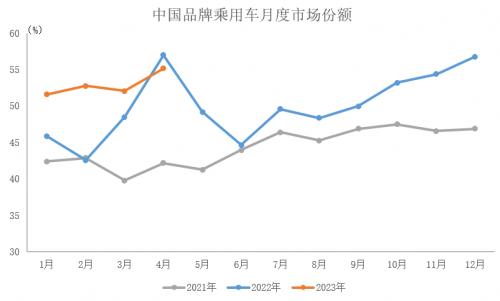 2023年4月,中国品牌乘用车销售99.9万辆,环比下降5%,同比增长81.4%,占乘用车销售总量的55.2%,占有率较上月增加3个百分点,比上年同期减少1.9个百分点。