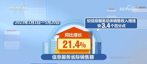 从信息方面来看,2017年—2022年,全国信息服务省际销售额年均增长22%,较信息服务总体销售收入增速快2.8个百分点。2023年1月1日—5月20日,信息服务省际销售额同比增长21.4%,较信息服务总体销售收入增速快3.4个百分点。