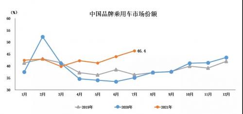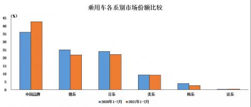 2021年1-7月,中国品牌乘用车销售492万辆,同比增长42.8%,占乘用车销售总量的42.6%,占有率比上年同期提升6.5个百分点。