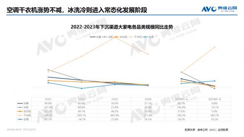 2023年M1-4大家电下沉市场零售额规模增长34.8%,但分产业来看,品类间则有一定的发展分化。其中干衣机品类在下沉市场仍处于发展期,低基数下干衣机下沉市场表现出超高的增速;空调产业相对成熟,但其在下沉市场的渗透率仍有空间,强大的需求基础也成为空调下沉的高增长核心驱动因素;而冰洗冷产业则进入高度成熟期,用户端与渠道端均呈现出饱和式发展的特点,2023年将进入常态化发展的新阶段。