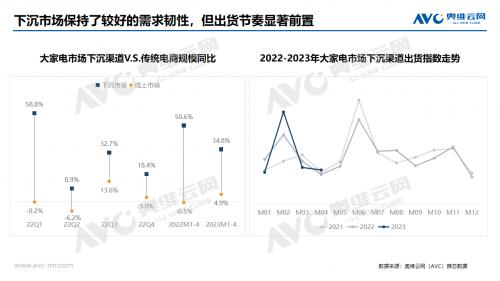 从规模增长来看,尽管经历了三年的发展,相较于传统电商渠道,下沉市场仍然表现出了强大的增长韧性。奥维云网(AVC)监测数据显示,2023M1-4,大家电产业在传统线上渠道的零售额同比增长4.9%,而下沉市场零售额同比增长34.8%,增速对比相对悬殊。但同时下沉市场的出货节奏也有显著变化,其中2023年2月出货指数高达189,侧面反映出行业的规模压力和对下沉市场的重视。