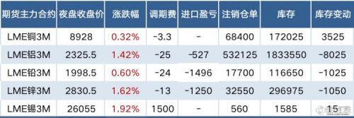 表1:有色金属国内主力合约行情(单位:元/吨)