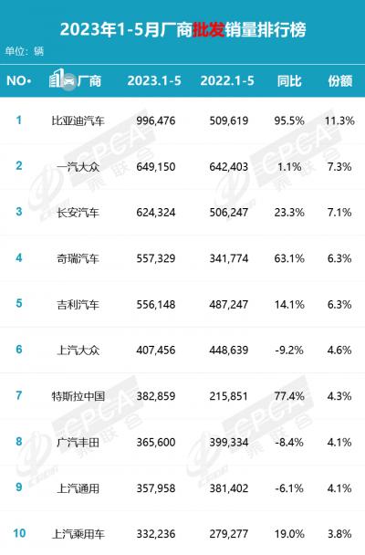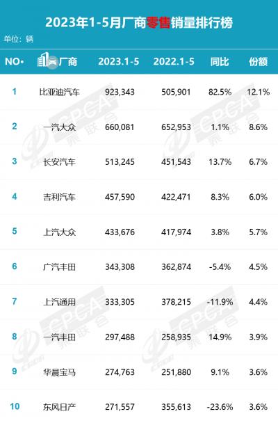 据中国汽车流通协会汽车市场研究分会(乘联会)最新零售销量数据统计,5月份国内狭义乘用车市场零售销量达174.2万辆,同比增长28.6%,环比增长7.3%;1-5月份累计销量763.2万辆,同比增长4.2%。