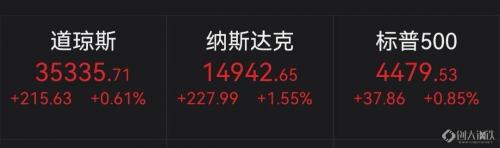 昨日,美国股市表现抢眼,三大指数集体收涨。其中,道指涨0.61%,报35335.71点;标普500指数涨0.85%,报4479.53点;纳指涨1.55%,报14942.65点,刷新历史新高。
