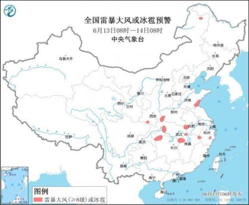 13日-15日,广东、广西、云南、贵州、西藏东南部等地部分地区有中到大雨,局地有暴雨或大暴雨,并伴有短时强降水、雷暴大风或冰雹等强对流天气。其中,6月13日08时至14日08时,陕西南部、山东南部、河南西部、安徽中部、湖北西部和东南部、湖南北部、江西北部、浙江中部等地的部分地区将有8-10级雷暴大风或冰雹天气;吉林东部、安徽中部、湖北西南部和东部、湖南北部、江西北部、浙江东南部和西北部、福建西北部、云南南部、广西东南部、广东中西部、海南岛东北部等地的部分地区将有短时强降水天气,小时雨量20-40毫米,局地可达60毫米以上。预计,强对流的主要影响时段为今天白天至夜间。
