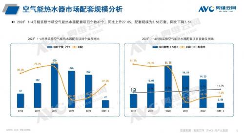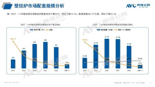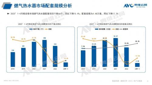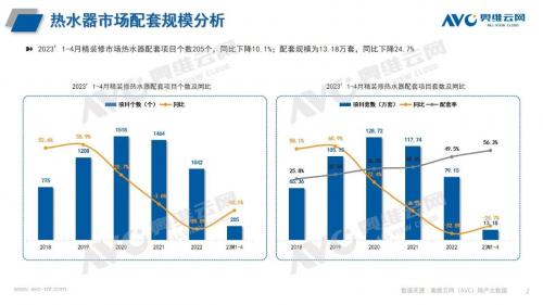 据奥维云网(AVC)地产大数据监测:2023年1-4月精装修开盘楼盘项目个数341个,精装修规模22.09万套,同比下降37.8%;精装热水器规模走势随大盘,2023年1-4月精装修市场热水器总体配套规模为13.18万套,同比下降24.7%,配置率56.3%,同比22年全年配置率上升6.9%。