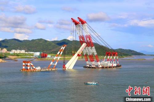 中新网珠海8月25日电 8月25日15时58分,随着3600吨大桥海鸥浮吊缓慢松钩,一座高106.8米(桥面以上)、重2800吨(含吊具)的钢塔精确落在28号墩0号块钢箱梁顶口,由中铁大桥局承建的世界首座公铁同层多塔斜拉桥——珠海珠机城际金海特大桥第三座钢主塔成功架设到位。