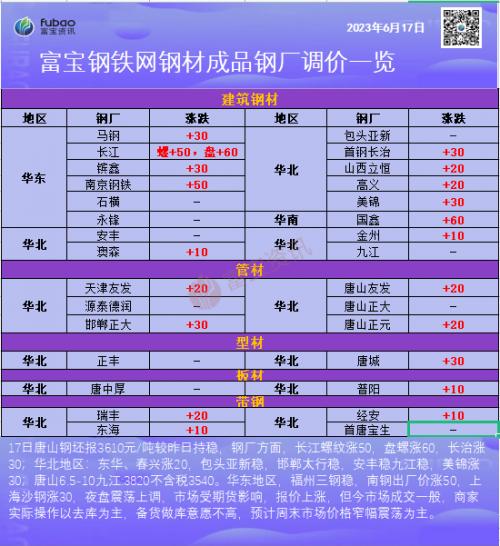 2.钢坯:6月17日唐山钢坯库存总计35.47万吨,较昨减少0.84万吨,其中:海翼宏润昨入库0.89出库1.38,现库存10.05万吨;象屿正丰昨入库0.4出库0.5,现库存10.65万吨;物产中大昨入库0.48出库0.64,现库存14.16万吨;中拓物流李钊庄昨入库0.01出库0.1,现库存0.61万吨。三、今日最新动态【周末成交快讯】17日唐山钢坯报3610元/吨较昨日持稳,钢厂方面,长江螺纹涨50,盘螺涨60,长治涨30;华北地区:东华、春兴涨20,包头亚新稳,邯郸太行稳,安丰稳九江稳,美锦涨30;唐山6.5-10九江:3820不含税3540。华东地区,福州三钢稳,南钢出厂价涨50,上海沙钢涨30,市场受周五夜盘影响,报价上涨,但今市场成交一般,商家实际操作以去库为主,备货做库意愿不高,预计明市场价格稳中调整。【热卷】今华北热卷价格小幅上涨,幅度0-40,唐山3890,邯郸3910,因周末市场休市,商户观望为主,谨慎操作,下游客户刚需采购,整体成交一般,预计短期市场价格稳中偏强为主。【带钢】今唐山145系窄带稳中涨10报3830-3840含税出厂,整体成交一般尚可;285-355系市场裸价现货3570-3590(主流3580)宏兴3585,现货较昨午后收盘价涨10-20。昨夜盘期螺继续走高,对厂商心态形成有力支撑,市场涨势格局未变,下游观望情绪有所转变。今周末交投氛围平平,考虑成本偏强,预计近日带钢坚挺为主。【管材】今唐山管材价稳中偏强,上涨幅度20-30,唐山主流焊管报4120涨20,主流镀锌管报5020涨20。昨夜盘持续震荡偏强,今市场延续涨势,管厂跟调积极,然淡季情况下,市场高位成交表现不佳,贸易商多逢高出货,谨慎补库,考虑成本支撑尚存,预计周末中板高位整理。【涂镀】今日涂镀主流价格偏强运行,博兴价格上调,幅度在30-50之间,受昨日夜盘影响,商家今日报价整体上涨,市场活跃度有所增加,成交尚可,预计明日价格窄幅震荡【中板】今华北中板稳中偏强调整,其中唐山主流4050稳中低位涨10,武安普阳3970较昨涨20,受周五期货夜盘偏强提振,周六市场延续涨价氛围,商家逢高积极出货,询盘尚可,成交不一高位显迟疑,钢厂方面,今普阳锁单价格3960,唐中厚指导价4050,成本支撑尚可,考虑近日持续高温天气或压制终端需求释放,商家预期坚挺观望,预计周末中板高位整理。【型材】唐山型材稳中高靠。角5-6.3#3890稳;槽8-16#3890涨30;工14-20#3970涨30。淡季需求并未改善,高价资源成交受阻,贸易商多出货回笼资金为主,市场成交好转程度有限,出货表现平平。预计周末型价将盘整运行为主。四、今日调价