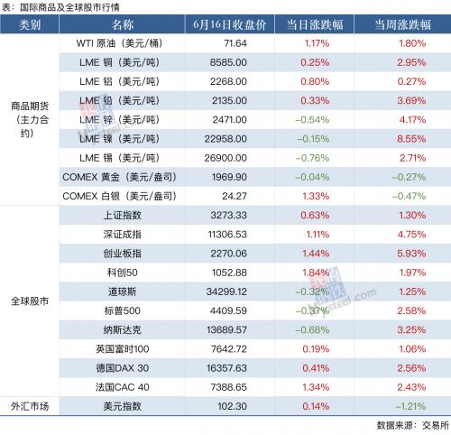 当周,商品期货方面,主要商品期货价格涨跌不一。其中,镍价格涨幅最高,达8.55%;白银价格跌幅最高,达0.47%。全球股市方面,中国股市和欧美股市基本上涨。其中,中国创业板指涨幅最高,达5.93%。外汇市场方面,美元指数收于102.30,下降1.21%。