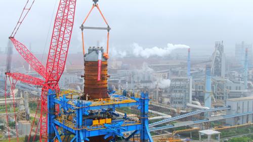 4月1日上午10点08分,国内首座百万吨级氢基竖炉最后一段炉壳开始吊装,经过900吨级履带吊1个小时的吊运,该段炉壳抵达竖炉塔82.3米高度位置,成功吊装到位,这标志着中国宝武宝钢股份湛江钢铁氢基竖炉炉壳全部顺利吊装完成,氢基竖炉工程建设进入炉顶结构安装高峰期。据悉,氢基竖炉本体炉壳分5段,第一段于2022年12月23日吊装完成,第二、三、四段于今年3月中下旬吊装完成,本次吊装的第五段炉壳是最后一段炉壳,高约12.6米,重约78.5吨。图为吊装现场。(黄子轩摄)