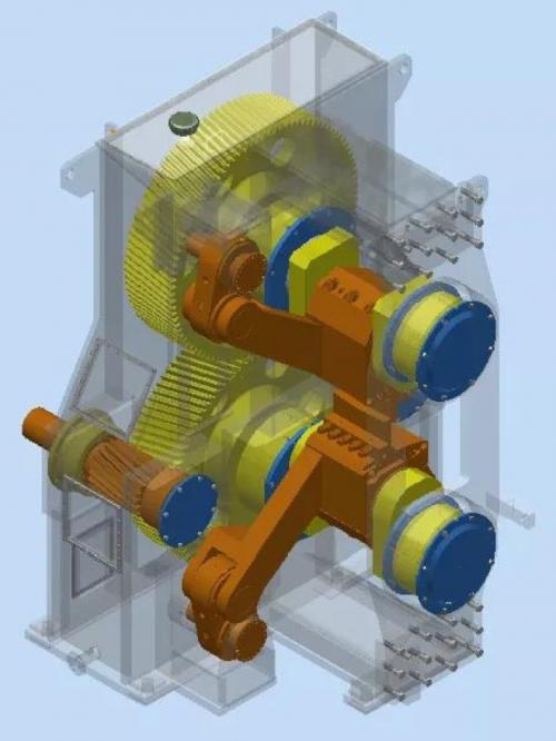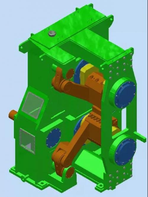 该机型的“0侧隙”双速比传动系统,既解决了单台飞剪无法同时满足“低速大断面”和“高速小规格”剪切要求的业界难题,又降低了剪切时的冲击性,提高了剪切的稳定性。一台双速比飞剪替代两台传统单速比飞剪,占地小的特点为场地受限的老厂产品升级改造项目创造了有利条件,同时也可以减少初期设备投资,节约后期的备件和运营维护费用,剪切模式(高速档、低速挡切换)切换方便,剪机的作业率大幅提高。该机型的高刚度双支撑对称结构箱体具有以下显著优点: