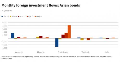 监管机构和债券市场协会的数据显示,外国投资者5月在印度、印度尼西亚、马来西亚、韩国和泰国净购买了价值101亿美元的债券,这是自2021年6月以来的最大月度流入量。