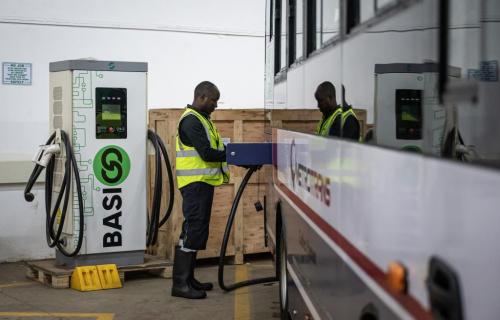 2023年6月2日,在肯尼亚内罗毕,肯尼亚电动巴士公司工作人员为电动巴士充电。新华社记者王冠森摄