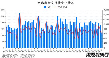 从船型来看,散货船的交付数量为208艘,共16048853载重吨;集装箱船的交付数量为112艘,共计678332TEU;油船的交付数量为79艘,共计7792197载重吨;化学品船的交付数量为46艘,共计1325822载重吨;液化气船交付数量为50艘,共计3954860立方米;海工船交付数量为219艘,共计894501载重吨;其他船型交付数量为131艘,共计680420载重吨。