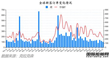 根据克拉克森最新数据统计(截至2023年6月8日),2023年5月份全球新签订单102艘,共计2,352,613CGT。与2023年4月份全球新签订单118艘,共计2,986,192CGT相比较,数量环比减少16艘,修正总吨环比下降21.22%。与2022年5月份全球新签订单130艘,共计3250624CGT相比较,数量同比减少28艘,修正总吨同比下降27.63%。