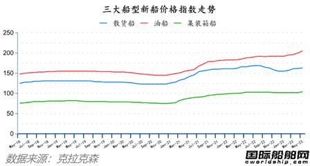 克拉克森数据显示,5月份散货船、油船、集装箱船新船价格指数环比分别上升1点、5点和2点至163点、205点、104点。