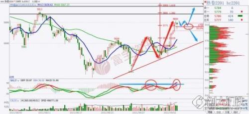 本周热卷期货主力合约整体行情是承接上周四的反弹行情,并且在周五晚上21:00至周一下午15:00,以放量阳开周线开局,同时在一小时周期,价格二穿MA13线,打钝化拐头,形成均现走平的底部结构特征,从而铸造了本周的震荡上行结构,K线在周一晚间冲高至5669受制于前高压力,出现回落,并在周二加速回落至5458,卡在支撑区间5460-5410的上沿走出震荡行情。虽然周四下午一度出现快速回落,但是价格依然没有打破5460的支撑区间上沿和均现走平的关键次级波峰位,随后放量交出倍量影线转阳K,形成一定的震盘特征,可见下方支撑力度很强,后期中阳踩线,带出MA13和MA60的分离金叉与MACD指标线贴合零轴分离金叉的共振结构,一路托价冲高至5820,高位处于完整波段落点5771附近,以高位震荡结束本周走势。