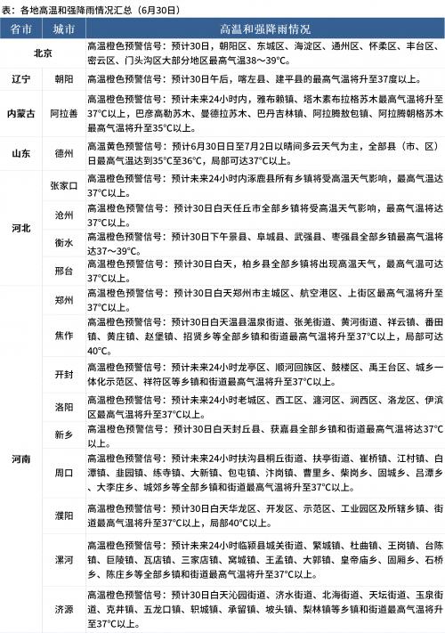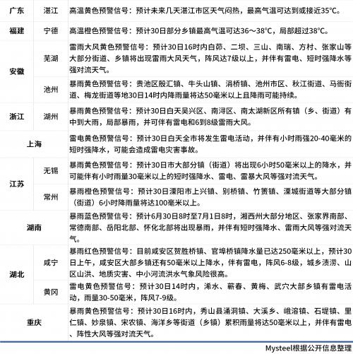 据Mysteel不完全统计,6月30日,北京、河北、河南、辽宁多地发布高温橙色预警信号,其中,河南焦作、濮阳局部地区最高气温将达到40℃;江苏、浙江、湖北多地发布暴雨预警信号,其中,湖北咸宁发布暴雨红色预警信号。具体情况如下: