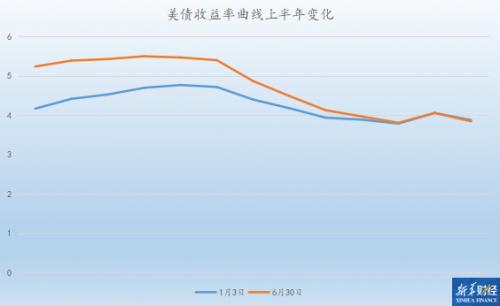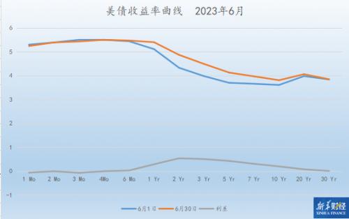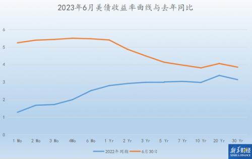 美国财政部数据显示,美债收益率曲线在6月总体趋平,1年期至10年期部分曲线上移,6个月以下短端与20年期以上超长端几乎维持不变。2年期美债收益率比月初上扬54个基点,10年期美债收益率涨20个基点。
