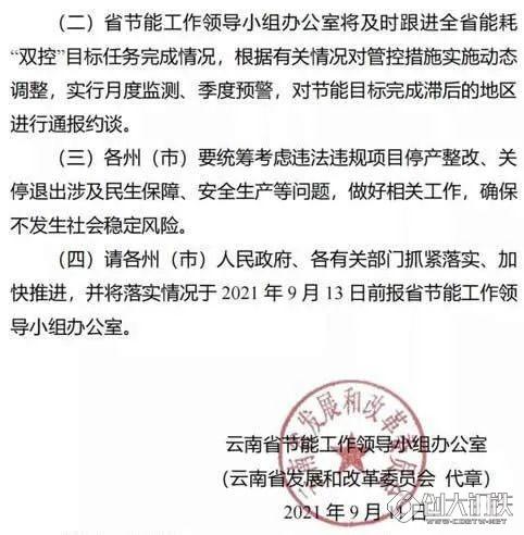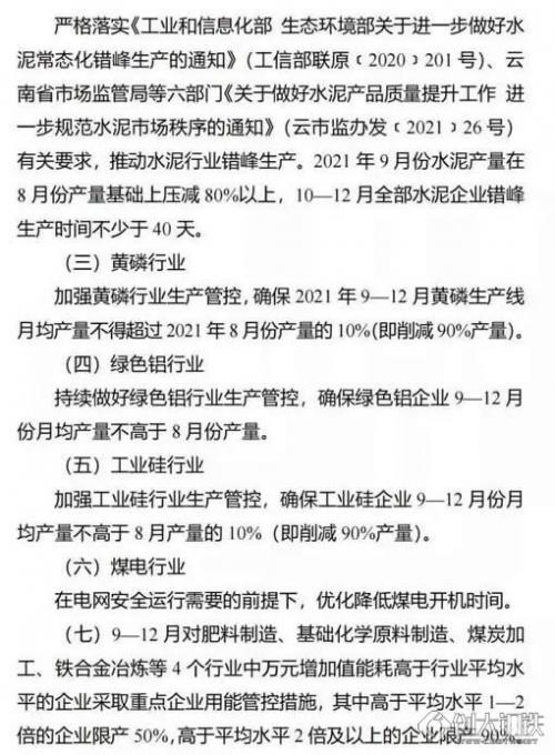 云南一份文件全网疯传,涉及钢铁、水泥、铝等行业日前,一份云南省节能工作领导小组办公室发布的《关于坚决做好能耗双控有关工作的通知》在全网疯传。该文件中要求加强重点行业管控,涉及钢铁行业、水泥行业、黄磷行业、绿色铝行业、工业硅行业和煤电行业。