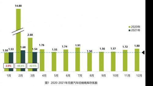 2021年4月10日,中国汽车流通协会发布2021年3月份“汽车经销商库存”调查结果:3月份汽车经销商综合库存系数为1.54,同比降幅较深达42.5%,环比下降8.3%,库存水平接近警戒线。