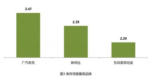 3月,库存深度超过2个月的品牌有6个,其中库存深度最高的品牌有:广汽菲克、斯柯达、东风英菲尼迪。