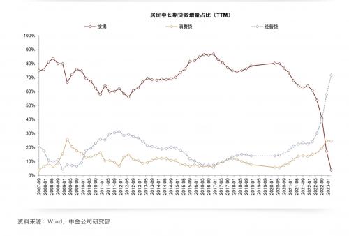 在居民中长期贷款的增量方面,中金公司数据显示,截至一季度末,按揭/消费贷/经营贷占居民中长期贷款余额占比分别为70%/11%/19%,但由于按揭增速快速下行,居民中长期增量结构出现较大变化,1Q23新增按揭/消费贷/经营贷占比分别为4%/25%/72%。