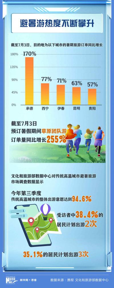 携程数据显示,截至7月3日,目的地为承德、西宁、伊春、昆明和贵阳的暑期旅游订单同比分别增长170%、77%、71%、63%和57%。草原游也是广受欢迎的避暑旅游主题,截至7月3日,预订暑假期间草原团队游的订单量同比增长255%。