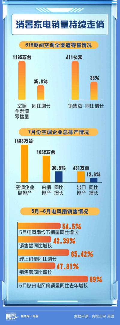 进入6月以来,气温逐渐攀升,连续的高温天气推高空调市场需求。据奥维云网(AVC)统计,今年“618”期间,空调全渠道零售量达1195万台,同比增长35.9%;销售额411亿元,同比增长38%。