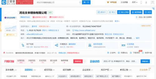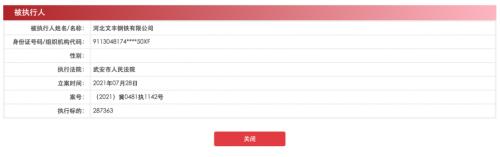 据企查查数据显示,文丰钢铁最近一次被武安市人民法院强制执行立案日期为2021年7月28日,案号为(2021)冀0481执1142号,执行标的28.7363万元。该案属于买卖合同纠纷,起诉文丰钢铁的是河北奥普森机械贸易有限公司,不过具体的判决文书并未公开。
