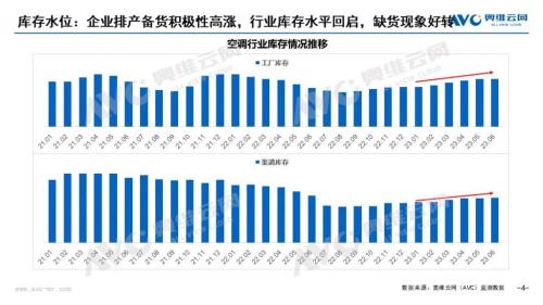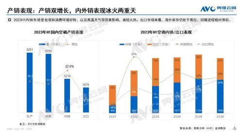 奥维云网(AVC)监测数据显示,2023H1空调市场产销双增长,生产9281万台,同比增长14.0%;销售9090万台,同比增长11.9%,其中内销拉动较大,内销出货5214万台,同比增长22.6%,相比之下出口市场受海外库存消化不完全,需求不景气等影响,回暖进程相对滞后,同比增长0.3%。而在厂商排产和渠道商备货积极性高涨的背景下,行业库存逐步回启,去年存在的严重缺货现象在今年得到了极大缓解。