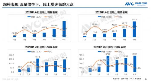 零售口径来看,根据奥维云网(AVC)推总数据,2023H1空调市场零售额达到1290亿元,同比增长18.5%;零售量达到3690万台,同比增长17.6%。分渠道来看,3月份之前,由于去年同期的低基数等原因,线下增速领先,到4月份之后随着电商平台和品牌促销活动的集中启动,线上增速开始领跑大盘。结果来看,2023H1线上零售额为650亿元,同比增长33.4%;线下零售额为640亿元,同比增长6.4%。