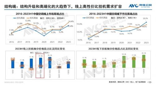 从结构来看,空调持续高端化、结构化升级的趋势没有发生改变。从奥维监测数据看,2023H1线下高端挂机份额达到20.3%,柜机高端份额达到18.6%。但是随着国内消费出现分级分化,空调的产品结构也出现分化,尤其表现在线上挂机在刚需性价比价格段占比提升,总体呈现K型分化走势。